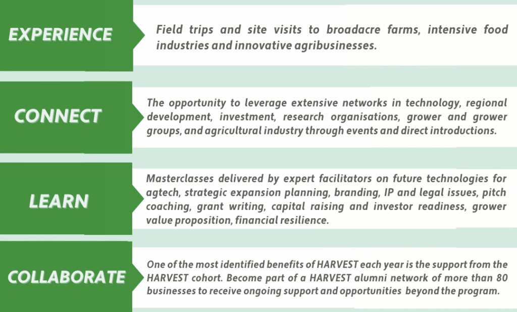 “We look forward to seeing our cohort of passionate innovators make valuable connections and build their capability and confidence. The program enables participants to develop closer relationships with businesses in the agriculture and food industry and to improve their product or services to address issues in the food production system.”
